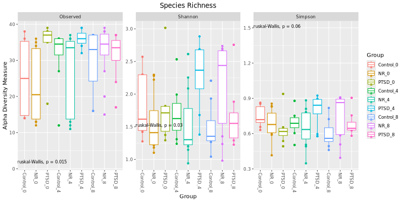 Below is a diversity of 3 commonly used indices showing the values for all the samples (dots) and in groups (boxes) at the species level.