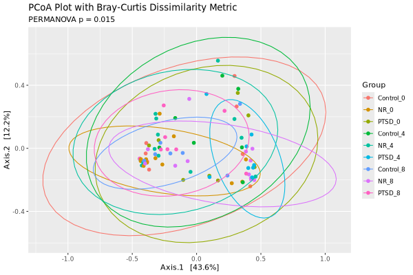 In our beta diversity analysis, Bray-Curtis dissimilarity matrix was first calculated and then plotted by the PCoA and