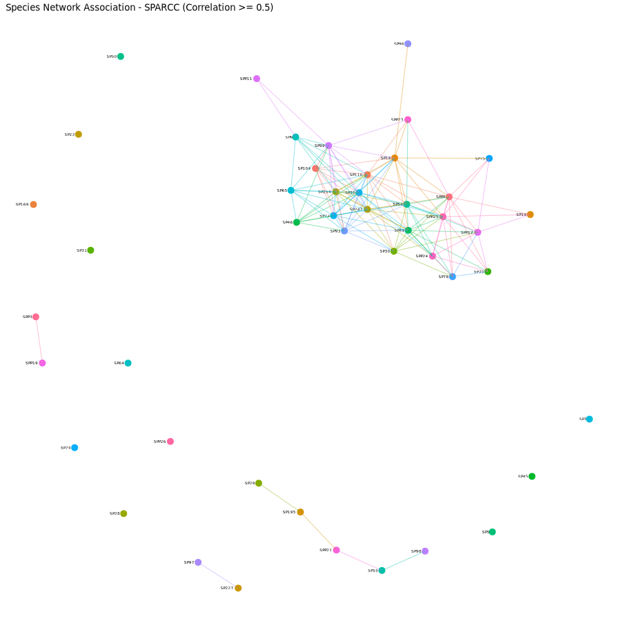 under-powered. We provide the network association result with SparCC (Sparse Correlations for Compositional data)(Friedman & Alm 2012), which