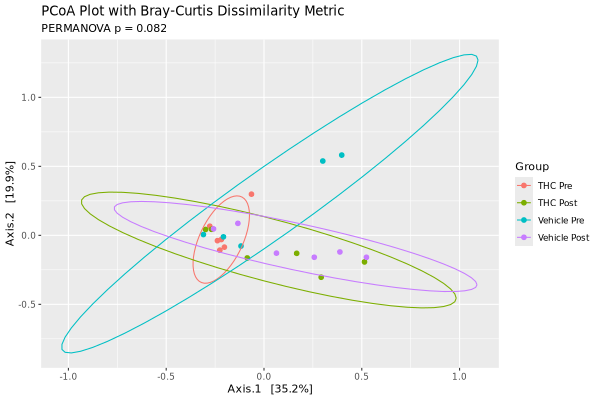 In our beta diversity analysis, Bray-Curtis dissimilarity matrix was first calculated and then plotted by the PCoA and