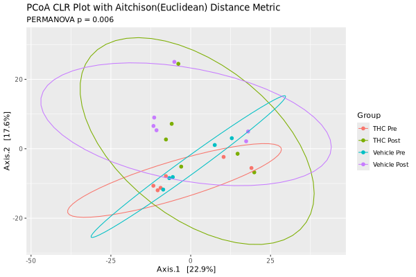 The above PCoA and NMDS plots are based on count data. The count data can also be transformed into centered log ratio (CLR)