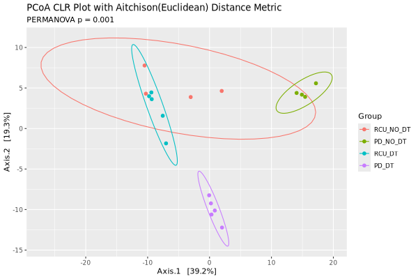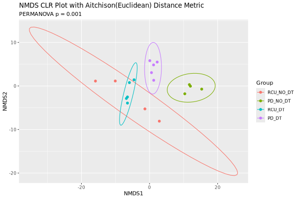 Below are the NMDS and PCoA plots of the Aitchison distances of the samples:
