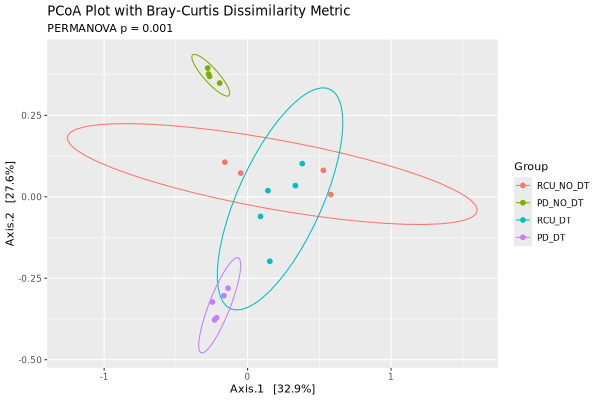 In our beta diversity analysis, Bray-Curtis dissimilarity matrix was first calculated and then plotted by the PCoA and