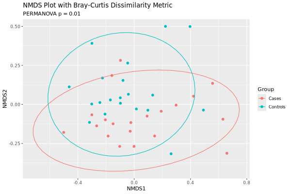 Below are the NMDS and PCoA plots of the Aitchison distances of the samples at the Species level: