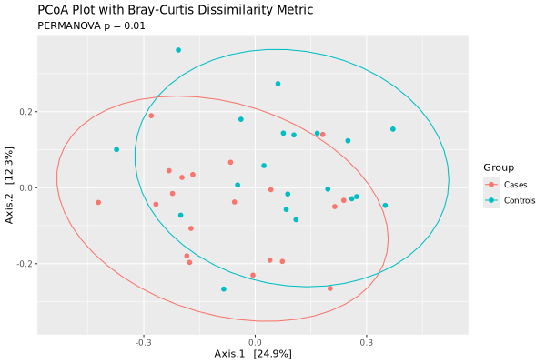 In our beta diversity analysis, Bray-Curtis dissimilarity matrix was first calculated and then plotted by the PCoA and