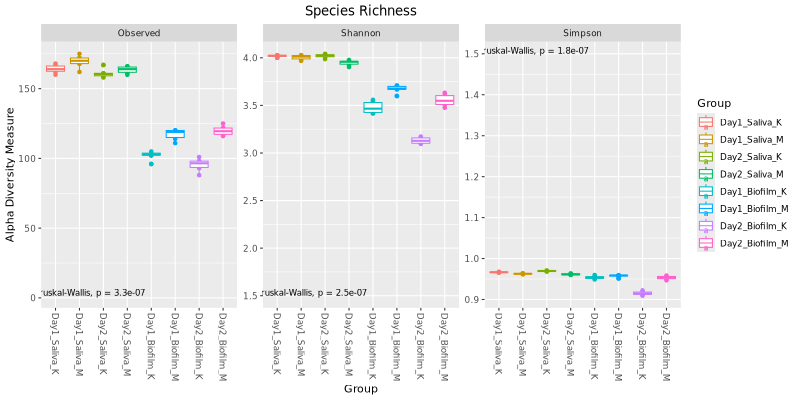 Below is a diversity of 3 commonly used indices showing the values for all the samples (dots) and in groups (boxes) at the species level.