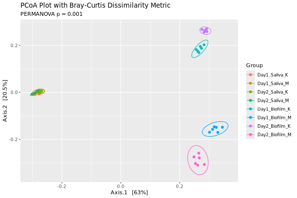 In our beta diversity analysis, Bray-Curtis dissimilarity matrix was first calculated and then plotted by the PCoA and