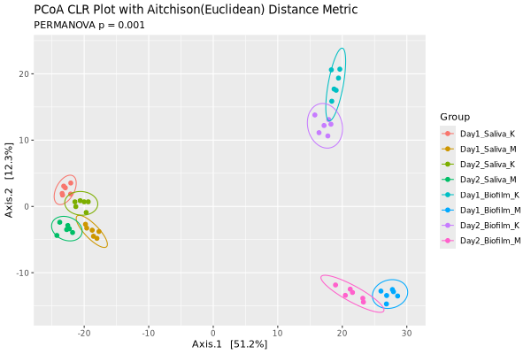 The above PCoA and NMDS plots are based on count data. The count data can also be transformed into centered log ratio (CLR)
