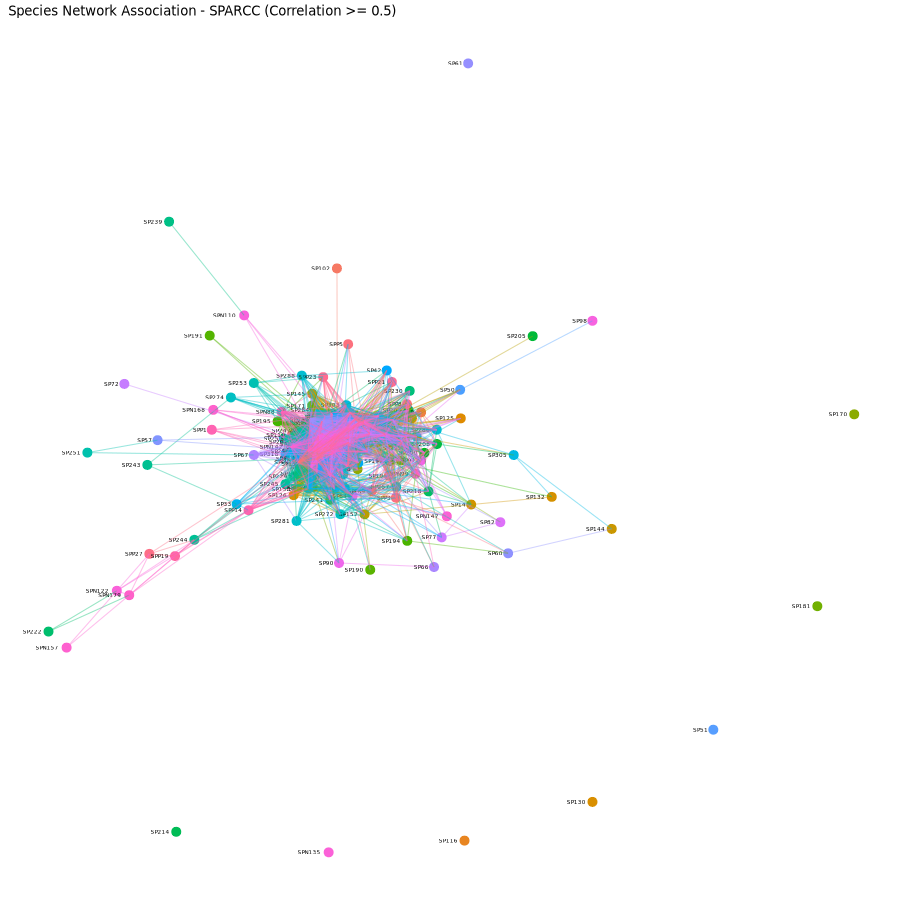 under-powered. We provide the network association result with SparCC (Sparse Correlations for Compositional data)(Friedman & Alm 2012), which