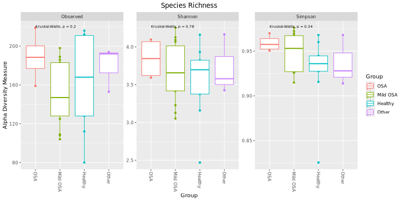 Printed on each graph is the statistical significance p values of the difference between the groups. The significance is calculated using either Kruskal-Wallis test or the Wilcoxon rank sum test, both are non-parametric methods (since microbiome read count data are considered non-normally distributed) for testing whether samples originate from the same distribution (i.e., no difference between groups). The Kruskal-Wallis test is used to compare three or more independent groups to determine if there are statistically significant differences between their medians. The Wilcoxon Rank Sum test, also known as the Mann-Whitney U test, is used to compare two independent groups to determine if there is a significant difference between their distributions.