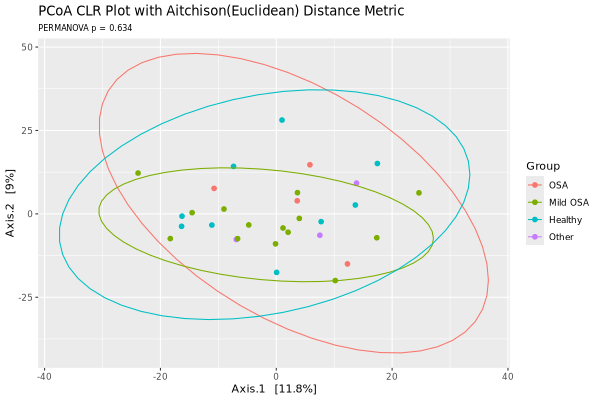 The above PCoA and NMDS plots are based on count data. The count data can also be transformed into centered log ratio (CLR) for each species. The CLR data is no longer count data and cannot be used in Bray-Curtis dissimilarity calculation. Instead CLR can be compared with Euclidean distances. When CLR data are compared by Euclidean distance, the distance is also called Aitchison distance.