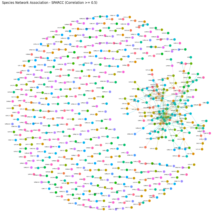 To analyze the co-occurrence or co-exclusion between microbial species among different samples, network correlation analysis tools are usually used for this purpose. However, microbiome count data are compositional. If count data are normalized to the total number of counts in the sample, the data become not independent and traditional statistical metrics (e.g., correlation) for the detection of specie-species relationships can lead to spurious results. In addition, sequencing-based studies typically measure hundreds of OTUs (species) on few samples; thus, inference of OTU-OTU association networks is severely under-powered. We provide the network association result with SparCC (Sparse Correlations for Compositional data)(Friedman & Alm 2012), which is a method for inferring correlations from compositional data. SparCC estimates the linear Pearson correlations between the log-transformed components.